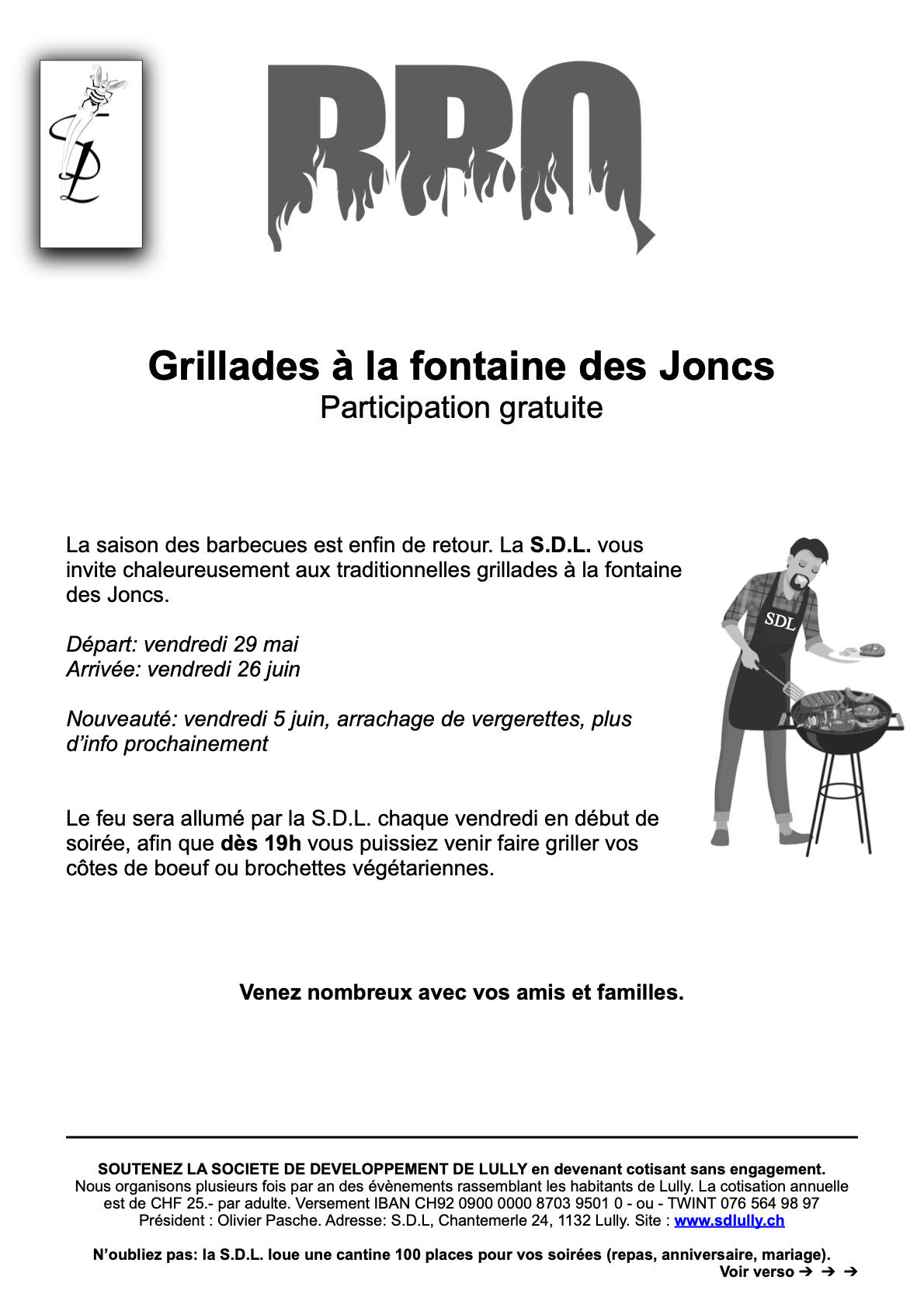 La saison des barbecues est enfin de retour.La S.D.L. vous invite chaleureusement aux traditionnelles grillades à la fontaine des Joncs.Le feu sera allumé par la S.D.L. chaque vendredi en début de soirée, afin que dès 19h vous puissiez venir faire griller vos côtes de boeuf ou brochettes végétariennes.NOUVEAUTÉ cette année: Grillades spécial Vergerettes le vendredi 5 juin.