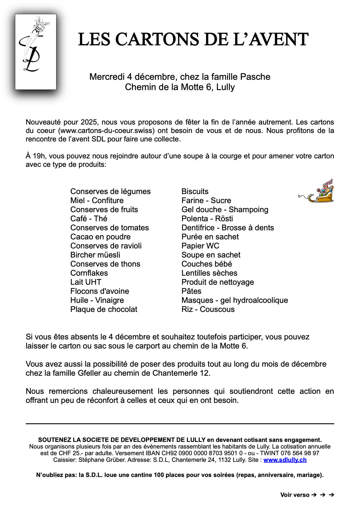 Si vous êtes absents le 4 décembre et souhaitez toutefois participer, vous pouvez laisser le carton ou sac sous le carport au chemin de la Motte 6.Vous avez aussi la possibilité de poser des produits tout au long du mois de décembre chez la famille Gfeller au chemin de Chantemerle 12.Nous remercions chaleureusement les personnes qui soutiendront cette action en offrant un peu de réconfort à celles et ceux qui en ont besoin.
