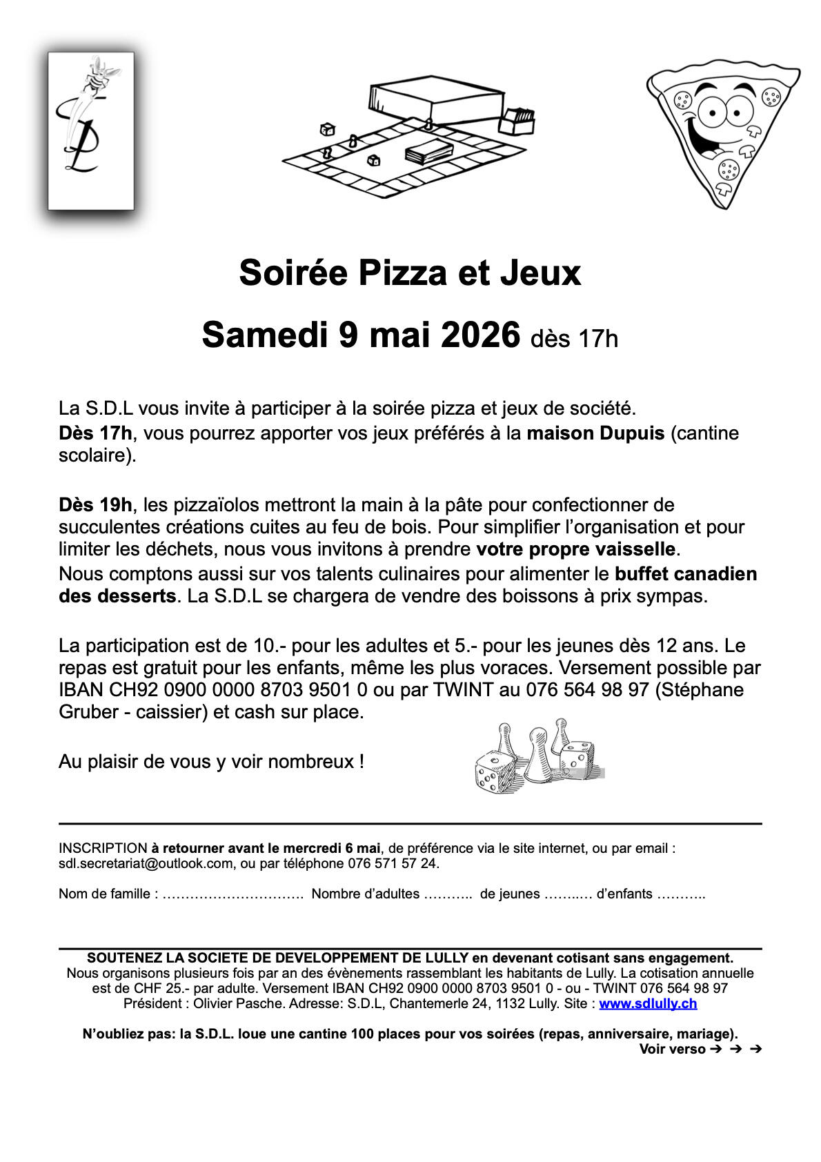 La S.D.L. vous invite à participer à la soirée pizza et jeux de société.Dès 17h, vous pourrez apporter vos jeux préférés à la maison Dupuis (cantine scolaire).Dès 19h, les pizzaïolos mettront la main à la pâte pour confectionner de succulentes créations cuites au feu de bois. Pour simplifier l’organisation et pour